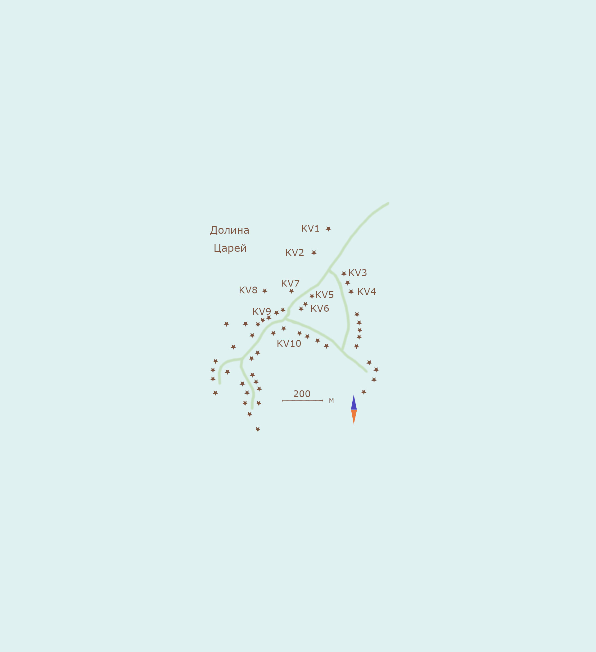 На рисунке 9.2 представлено примерное расположение объектов в Долине Царей. В начале девятнадцатого века Джон Уилкинсен приступил к составлению планов сооружений и пронумеровал их. Предложенная им система обозначений признана научным сообществом и используется до нашего времени.