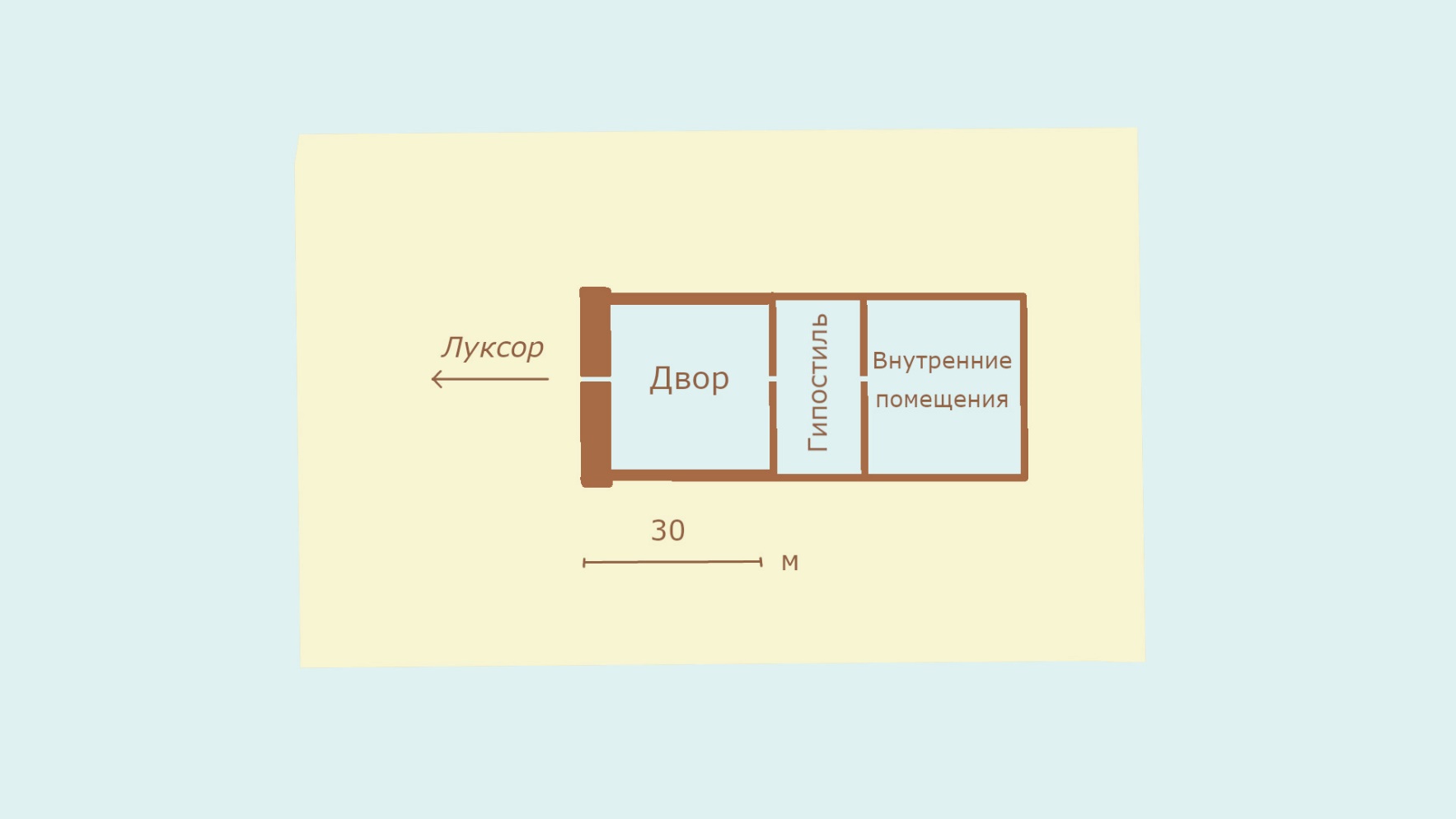 Описание храма. В интернете можно легко найти план комплекса Луксора. Даже беглого взгляда достаточно, чтобы увидеть индивидуальные особенности, отличающие этот объект от других аналогичных египетских сооружений. Как правило, дворы имеют форму прямоугольника, здесь же планировка строения выглядит по-другому.