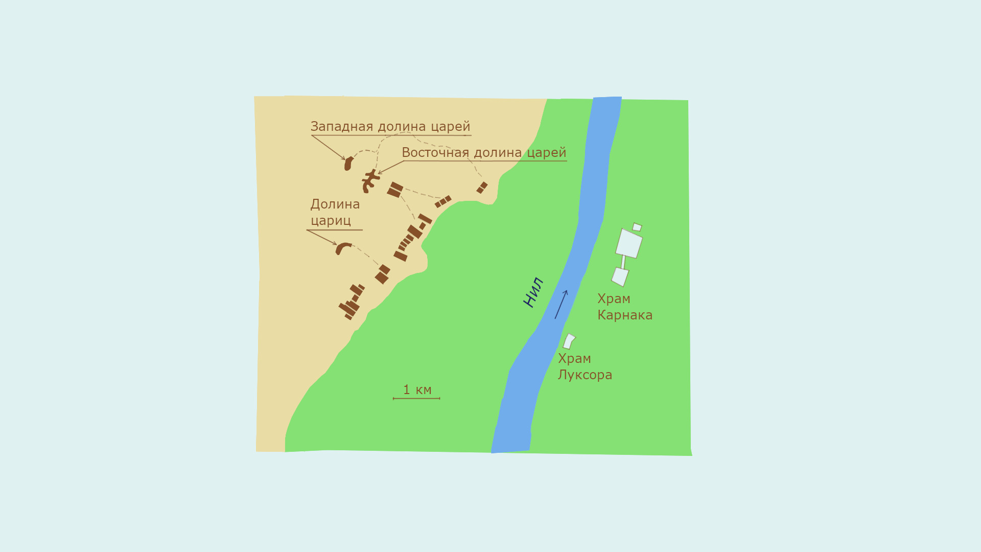 Самым известным историческим памятником является Долина Царей. В свою очередь, это место подразделяется на восточную и западную части. Археологами открыто больше шестидесяти таких сооружений. Особую известность данной группе подземных помещений принесли раскопки объекта KV62, где была найдена богатая коллекция золотых изделий, в том числе и «Маска фараона Тутанхамона».