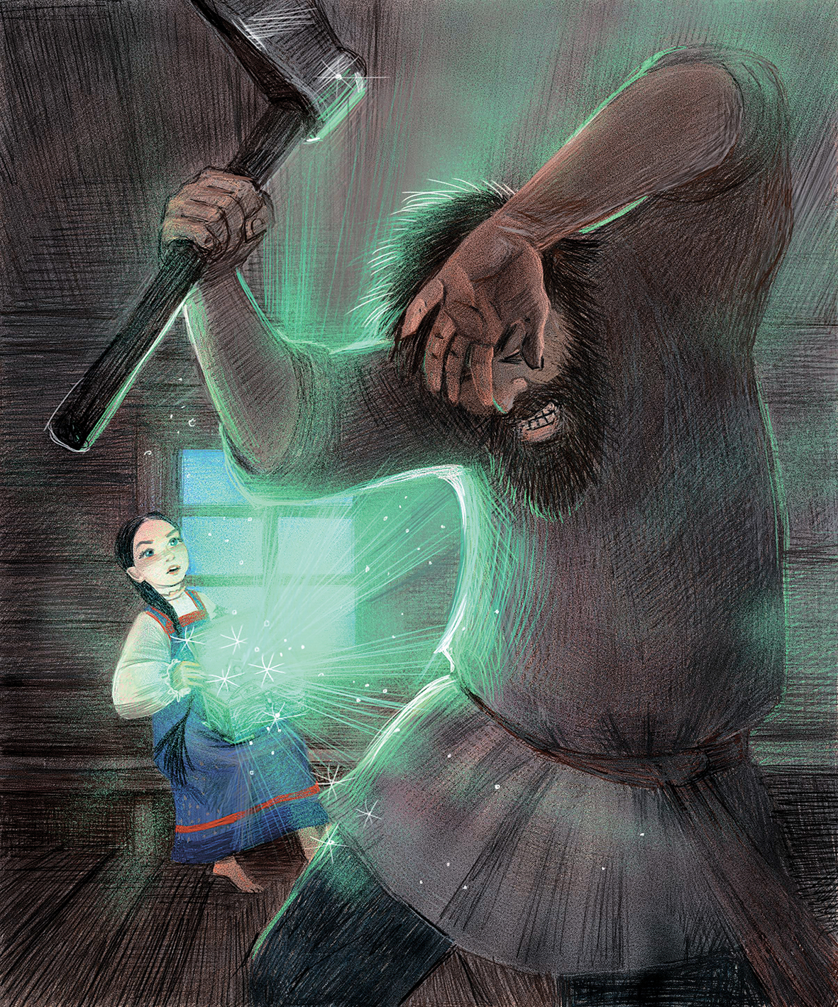Уехали опять все семейные. Танюшка хватилась шкатулки, а её быть бывало. Горько это показалось Танюшке, а тут вдруг теплом её опахнуло. Что за штука? Откуда? Огляделась, а из-под полу свет. Танюшка испугалась – не пожар ли? Заглянула в голбец, там в одном уголке свет. Схватила ведро, плеснуть хотела – только ведь огня-то нет и дымом не пахнет. Покопалась в том месте, видит – шкатулка. Открыла, а камни-то ровно ещё краше стали. Так и горят разными огоньками, и светло от них, как при солнышке. Танюшка и в избу не потащила шкатулку. Тут в голбце и наигралась досыта.