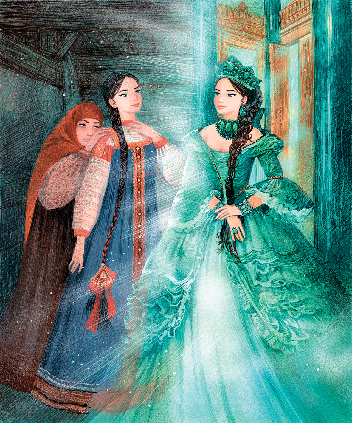 Повернулась Танюшка – перед ней помещение, какого она отродясь не видывала. Не то церква, не то что. Потолки высоченные на столбах из чистого малахиту. Стены тоже в рост человека малахитом выложены, а по верхнему карнизу малахитовый узор прошёл. Прямо перед Танюшкой, как вот в зеркале, стоит красавица, про каких только в сказках сказывают. Волосы как ночь, а глаза зелёные. И вся-то она изукрашена дорогими каменьями, а платье на ней из зелёного бархату с переливом. И так это платье сшито, как вот у цариц на картинах. На чём только держится. Со стыда бы наши заводские сгорели на людях такое надеть, а эта зеленоглазая стоит себе спокойнёшенько, будто так и надо. Народу в том помещенье полно. По-господски одеты, и все в золоте да заслугах. У кого спереду навешано, у кого сзаду нашито, а у кого и со всех сторон. Видать, самое вышнее начальство. И бабы ихние тут же. Тоже голоруки, гологруды, каменьями увешаны. Только где им до зеленоглазой! Ни одна в подмётки не годится.