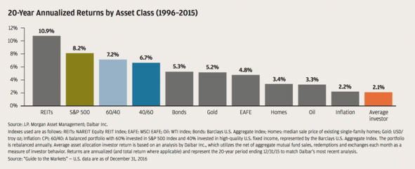 Для профессионалов финансового рынка возможности неподготовленных индивидуальных инвесторов очевидны. Как указано в графике средний непрофессиональный инвестор едва покрывает инфляцию.
