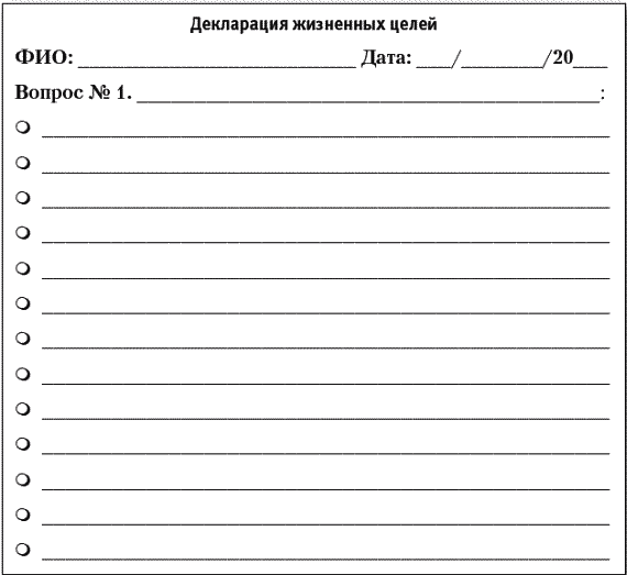 Вот форма, которую Вы можете использовать в работе над Вашей Декларацией жизненных целей.