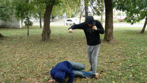 При уходе вниз, можно сразу нанести сильный «высекающий» удар в колено или в голень опорной ноги противника.