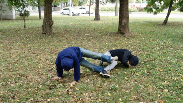 Защититься от удара «прыжком вниз» и упав в Negativa de Angola (нижняя защитная позиция, на носке одной ноги, с опорой на обе руки, тело находится близко к земле) зацепить выброшенной вперед правой ногой, переднюю ступню противника.