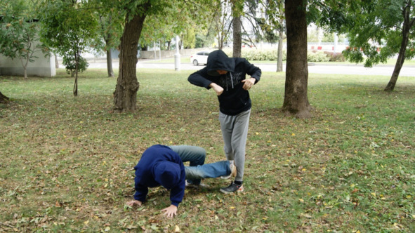 …сразу же нанести прямой горизонтальный удар в колено и воздействуя двумя ногами на «пойманную» ногу противника свалите его.