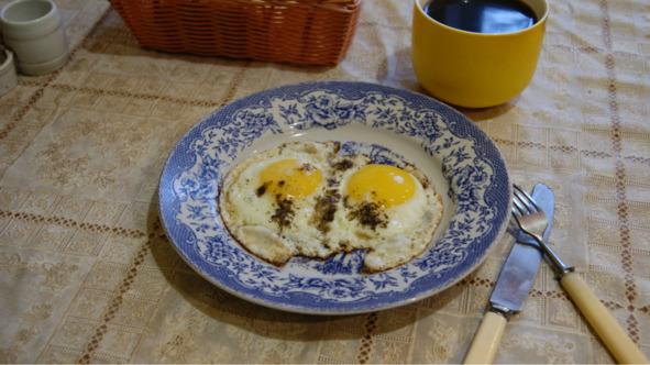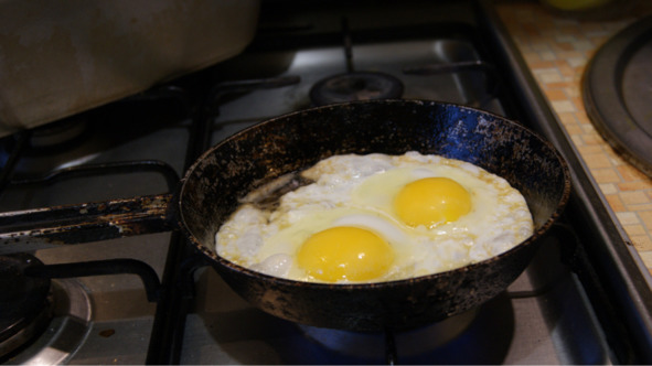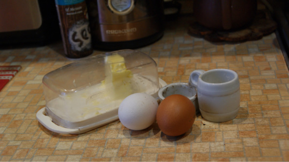 масло сливочное, два куриных яйца, морская соль, черный молотый перец.