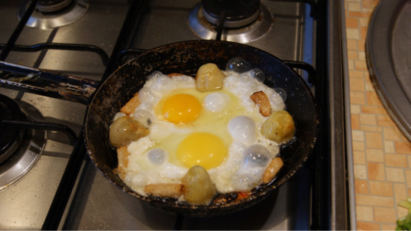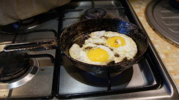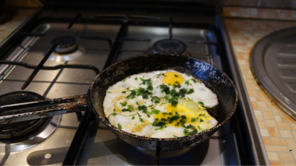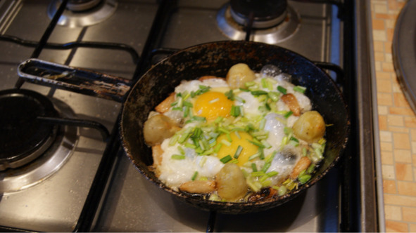 Старая картошка, молодая черемша и вечные яйца – на выходе яичница и собирательный образ современного ножевого боя.