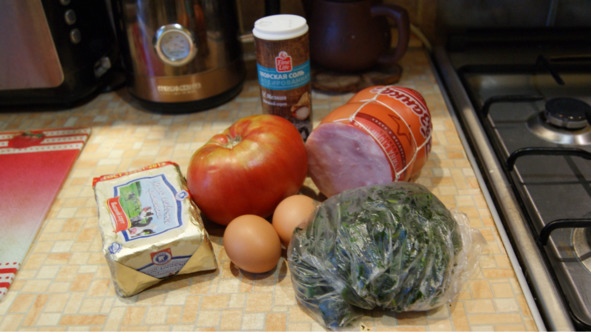 Для приготовления яичницы понадобится: масло сливочное, помидор (чем больше, тем лучше), кусок толстой ветчины или вареной колбасы, два куриных яйца, резанная мороженная или свежая зелень (кинза и петрушка), морская соль.