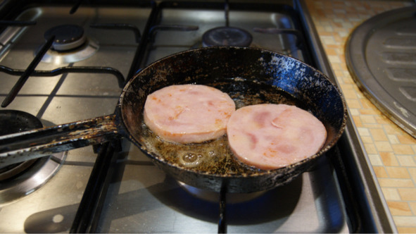 3. На среднем огне быстро обжарить два круга ветчины или колбасы.