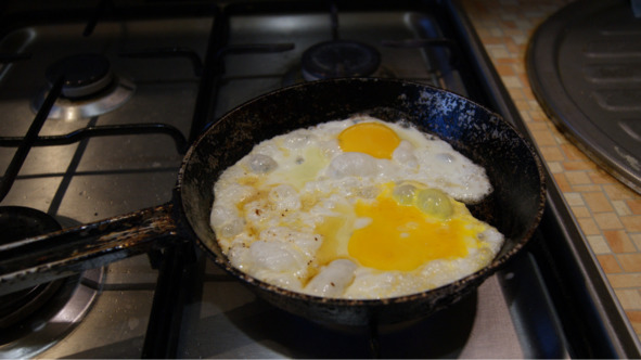 4. Разбить яйца на сковороду, по возможности не повредив желтки