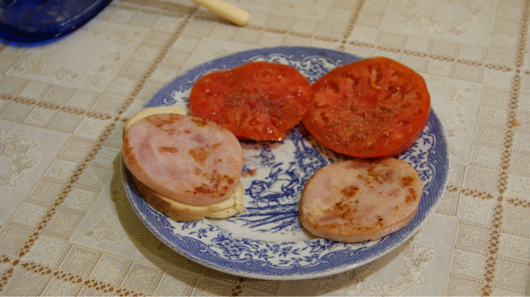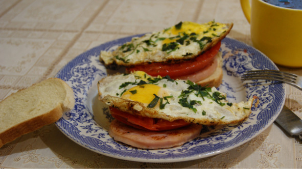 6. Когда через две-три минуты белок уплотнится, выложить глазунью на тарелку с помидорами. Если полученное блюдо разрезать посередине, а половинки разместить на кусках хлеба поверх помидоров и ветчины, то получиться пара четырехслойных полноценных бутербродов.