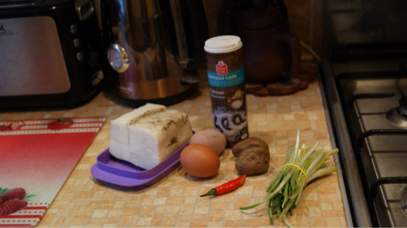 Для приготовления яичницы понадобится: шесть кусочков соленого свиного сала, две-три мелких картофелины «в мундире», острый красный перец, два куриных яйца, десяток стеблей черемши, соль.