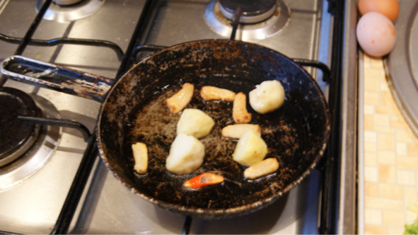 2. Очистить картофелины, быстро поджарить с одной стороны, перевернуть. Когда вкусная (выращенная родней в станице) крупная и средняя картошка съедена, остается мелкая, но ее чистить неудобно, выкинуть жалко, можно отваривать в кожуре, очищать и обжаривать для гарнира.