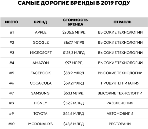 Если мы оглянемся на несколько лет назад, то увидим, что тогда список самых дорогостоящих компаний мира возглавляли крупные промышленные корпорации, такие, как Exxon Mobil, General Electric и т. д. Сейчас же в топ вышли ИТ-компании. Ниже – список самых дорогих брендов мира за 2019 год по версии Forbes, и большинство из первой двадцатки – из сферы информационных технологий.