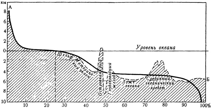 Гипсометрическая кривая (сплошная линия) и рельеф дна Мирового океана