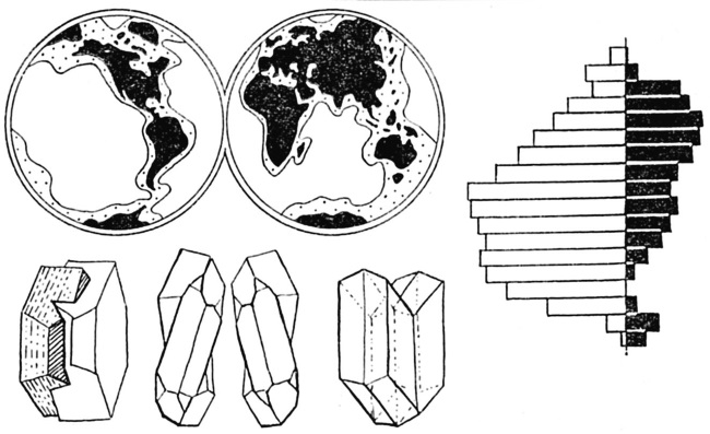 Внизу – двойники кристаллов. Кристаллы бывают «правыми» и «левыми», их количество в земной коре одинаково; у них, в отличие от живых организмов, отсутствует диссимметрия, устойчивое нарушение симметрии