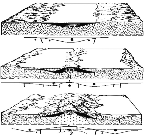 Идея геосинклиналей появилась потому, что в таких зонах было установлено скопление толщ осадочных пород большой мощности, смятых в складки и прорванных вторжениями (интрузиями) магматических пород. Мысль парадоксальная: горы возникают там, где прогибалась земная кора.