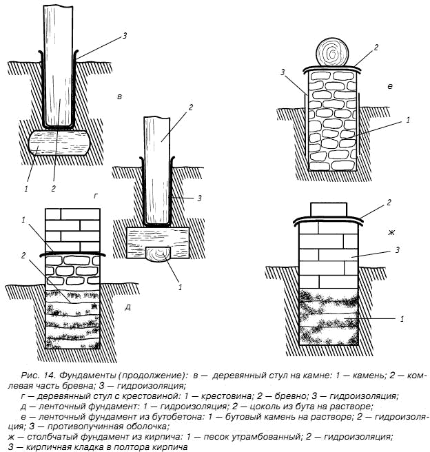 Деревянный стул – это комлевая часть ствола диаметром 20–40 см, установленная на чурбак (так называемый стул с лежнем) либо на деревянную крестовину (стул с крестом). Поставив стул в вертикальное положение, его следует закрепить на опорах крепкими косынками. Как опоры для деревянного стула можно использовать камень, кирпич или доски. Так как баня представляет собой небольшое строение, ее фундамент может быть вытолкнут из грунта даже при достаточно глубоком его заложении. Чтобы такого не случилось, основание следует защитить специальной противопучинной оболочкой: зазор, образующийся между почвой и фундаментом, заполнить песком или мелким гравием. Однако для более надежной защиты подходит полиэтиленовая пленка, сложенная в два слоя и смазанная пластичной или консистентной специальной смазкой БЛМ-3 либо солидолом, смесью отработанного ма шинного масла и садового вара, только перемешивать их надо в нагретом состоянии. Эта оболочка должна покрывать фундамент на глубину не менее 70 % от промерзания почвы.