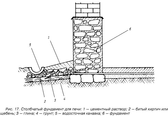 В связи с этим между фундамент печи и фундаментом основного строенияобразуется промежуток в 3–6 см, который необходимо проложить двумя слоями рубероида или засыпать песком. Это нужно сделать для того, чтобы эти два фундамента могли спокойно перемещаться относительно друг друга. Для печей иногда изготавливают и столбчатый фундамент (рис. 17, 18). Его обычно сооружают из четырех столбов, которые устанавливаются по углам будущей печи. На столбы устанавливают прочную плиту из железобетона или раму из стальных профилей.