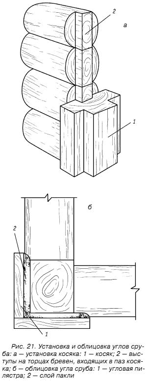 В проемы для дверей и окон устанавливаются косяки, состоящие из порога и верхнего и боковых брусьев, соединяющиеся со срубом в шип, но для этого в них нужно сделать пазы (рис. 21).
