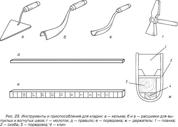 Для строительства стен из кирпича потребуются специальные инструменты. Это кельма (или мастерок) – лопатка, сделанная в форме треугольника, оснащенная короткой ручкой, растворная лопата (вместо нее можно использовать обыкновенную совковую лопату), расшивки для обработки швов в кладке, а также молоток-кирочка для раскалывания и отесывания кирпича (рис. 23).