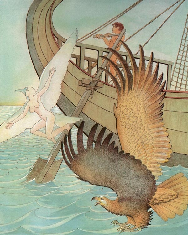 Когда корабли покинули берег, она прыгнула в воду и, схватив руль того корабля, который нес Миноса, стала его нежеланным спутником. Морской орел, сидящий на реях (а это был ее отец, который принял такое обличье) увидев ее, набросился и стал бить неблагодарную дочь своим клювом и когтями. В страхе она отпустила корабль и упала бы в воду, но какое-то милосердное божество превратило ее в чайку.