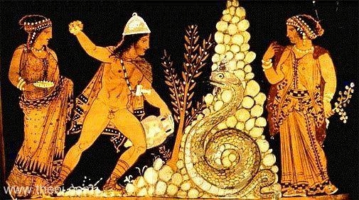 Желая принести жертву Юпитеру, он послал своих слуг поискать чистую воду для возлияния. Недалеко стояла старая роща, которая никогда не осквернялась топором, а в центре нее была пещера, покрытая густыми зарослями кустов; ее крыша образовывала низкую арку, из-под которой вырывался источник чистейшей воды. В пещере скрывался ужасный змей с хохолком на голове и чешуей, сверкающей, словно золото. Его глаза горели, как огонь, его тело было раздуто от яда, его тройной язык дрожал и показывал тройной ряд зубов. Как только тирийцы погрузили свои кувшины в источник, и раздался плеск воды, сверкающий змей поднял свою голову из пещеры и издал ужасный свист. Сосуды выпали из их рук, кровь отхлынула от лица, они задрожали всем телом. Змей, извивая свое чешуйчатое тело в огромное кольцо, поднял голову так, что возвысился над вершинами самых высоких деревьев и, пока тирийцы от страха не могли ни бороться, ни убежать, погубил одних своими клыками, других – в складках тела, третьих – ядовитым дыханием.