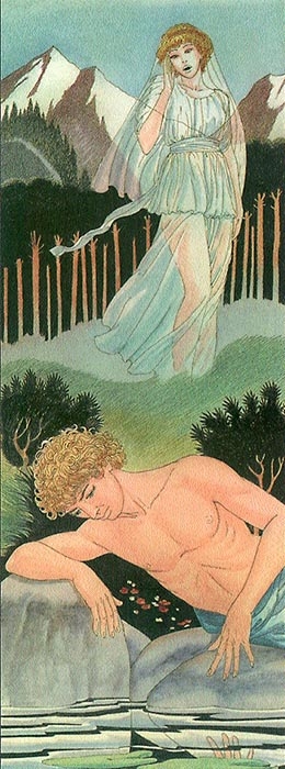 Был в тех местах источник с водой, чистой как серебро, к которому пастухи никогда не приводили свои стада, где никогда не бывали горные козы и никакие лесные звери; который не покрывался опавшими листьями или ветками; лишь зеленая свежая трава росла вокруг него, и скалы прикрывали его от солнца. Однажды юноша пришел сюда, утомленный охотой, разгоряченный и жаждущий. Он склонился, чтобы попить, и увидел свое отражение в воде. До чего же он изумился при виде собственного дивного образа! Он подумал, что это какой-то прекрасный водный дух, живущий в источнике. Он стоял, глядя с восхищением на яркие глаза незнакомца, локоны, вьющиеся, как локоны Аполлона, округлые щеки, шею слоновой кости, алые губы и сверх того от всего облика исходило сияние здоровья и силы. Он влюбился в самого себя. Он поднес свои губы ближе для поцелуя; он погрузил свои руки, чтобы обнять возлюбленного, но… Тот исчез от прикосновения, но через мгновение вернулся и вновь обрел очарование.