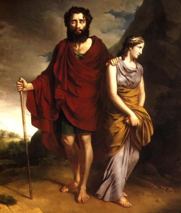 Когда ослепленный Эдип отправился в добровольное изгнание, лишь Антигона, его дочь, одна разделила его странствия и оставалась с ним до самой его смерти, а затем вернулась в Фивы.