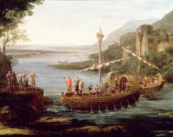 Эней проснулся и сразу же повиновался дружественному видению. Он принес жертву Юноне и призвал бога реки и всех его притоков оказать ему помощь. Потом впервые судно, полное вооруженных воинов, поплыло по Тибру. Река сглаживала свои волны и наказывала своему потоку течь спокойно, тогда как приведенное в движение сильными ударами весел судно быстро неслось вверх по течению.