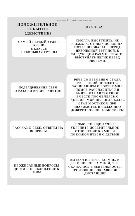 Понаблюдайте, какие «маячки» нашла в своем первом уроке. Они отражены в таблице 3.1, где описанные действия (изначально покажутся неприятными) приведут к позитивным решениям. Да-да, к позитивным.
