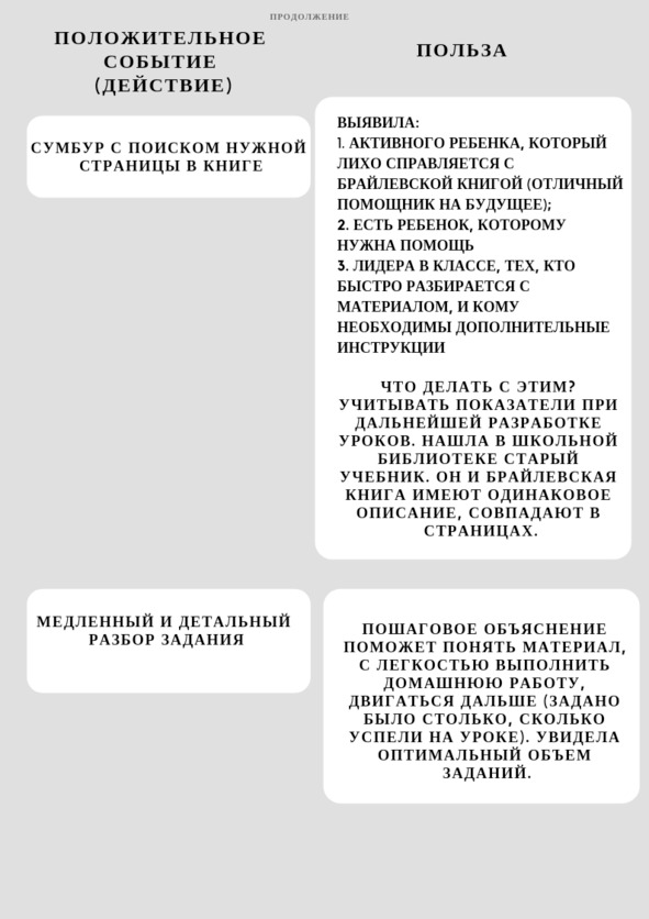 На протяжении урока проявились заминки с заданиями. Те учащиеся сели вместе и разбирались с книгой. Я только радовалась: «Вот как хорошо, сотрудничают». Пока они выполняли задания, другие дети ушли вперед и желали проработать материал. Рабочий шум на уроке усиливался, мне нужно было разорваться между группами: одни не успевают, а другие бегут вперед. Решила сделать так: обозначила задания и из шустрых ребят выделила одного, чтобы он консультировал остальных. А сама в этот момент взаимодействовала с теми двумя учениками. Затем они вместе со мной проверяли решённые задания остальных. К концу урока подвела итоги, обозначила домашнюю работу и всем пожелала хорошего дня.