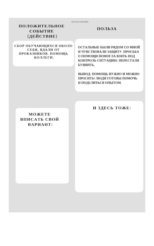 После этого отметьте положительные моменты. Найдите в своей истории пользу и украсьте ее. Зафиксируйте ниже.