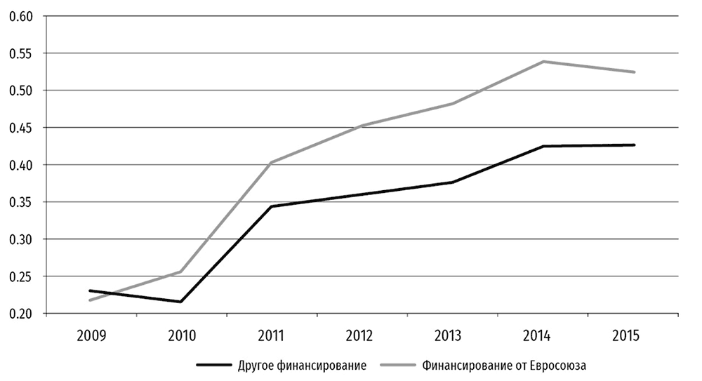 Для начала, не предполагая заранее, что в Венгрии сформировалось криминальное государство и нормализовалась коррупция, мы предлагаем взглянуть на изменения коррупционного риска, традиционно измеряемого на основании присутствия конкуренции и публичного объявления о проведении торгов. Мы наблюдаем резкое увеличение этого показателя после 2010 года. Как видно на Схеме 5.8, показатель, связанный с госзакупками, использующими деньги Евросоюза, был на уровне 0.21 в 2009 году. К 2011 году он вырос до 0.4 и достиг максимального значения 0.54 в 2014 году. Однако несмотря на то, что сами эти цифры могут потенциально указывать на системное, качественное изменение в процедуре проведения госзакупок, теоретически такую тенденцию можно объяснить участившимися случаями обычной коррупции и захвата государства как организованными государственными акторами, так и обходящимися без координации из единого центра.