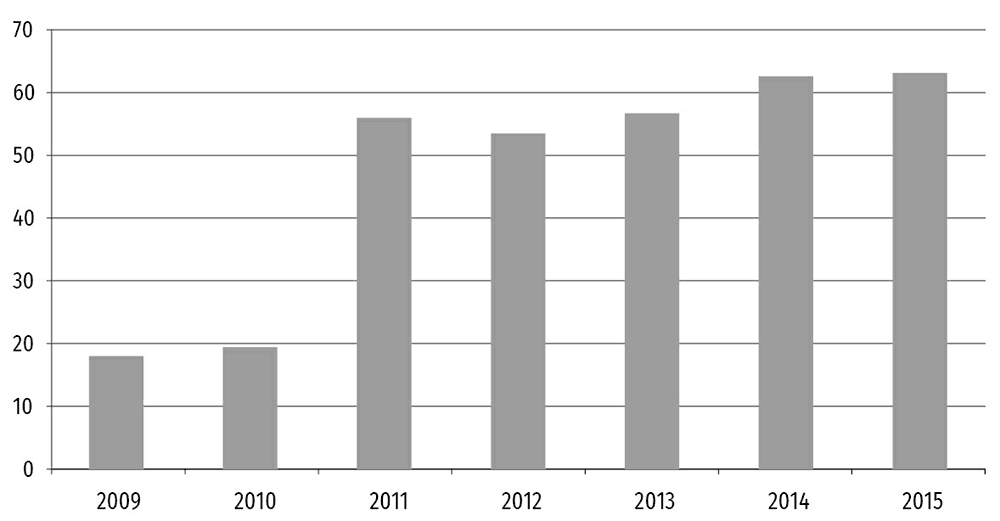 Схема 5.9: Доля госзакупок, проведенных в рамках тендеров, не объявленных публично, в их процентном соотношении к общему количеству тендеров на госзакупки в Венгрии, 2009–2015 годы (Общее число закупок: 121 849). Источник: Будапештский центр исследования коррупции, 2016
