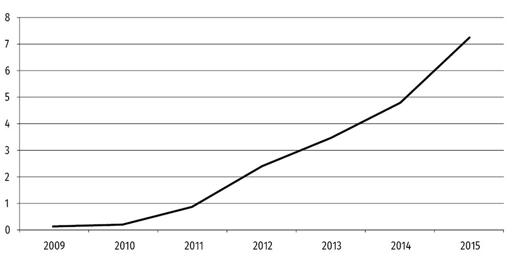 Пояснение: Среднеквадратичная погрешность стоимости контрактов на госзакупки в Венгрии по отношению к теоретическому распределению (по закону первой цифры Бенфорда) по годам, 2009–2015 годы, общее число закупок: 123 224