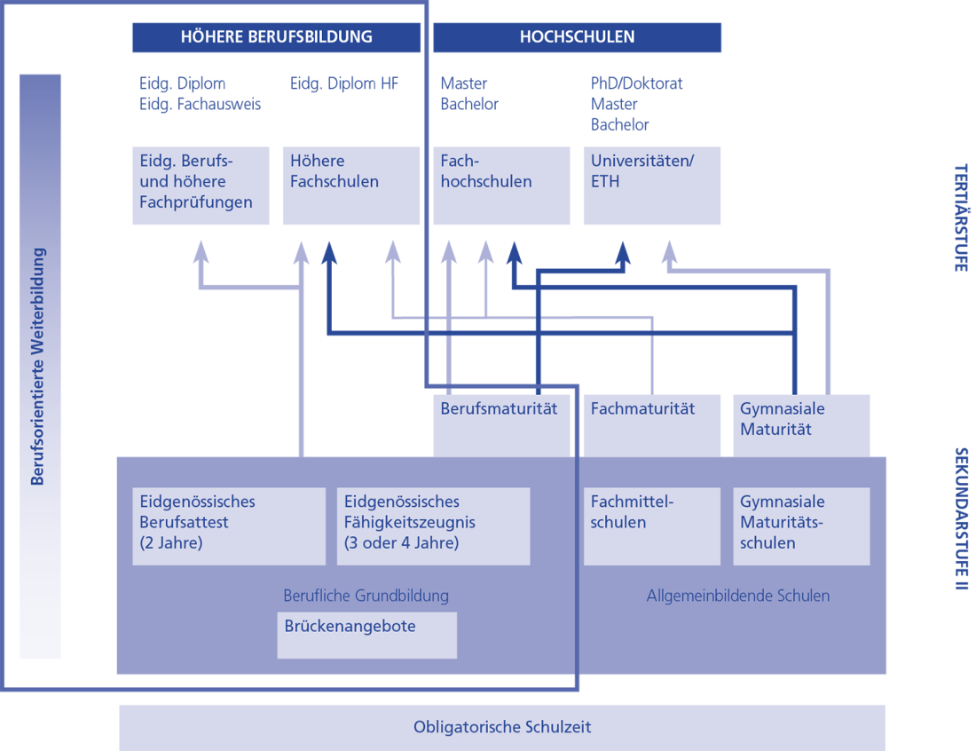 Die Berufsbildung beinhaltet die Bereiche Brückenangebote und berufliche Grundbildung, die auf der Sekundarstufe II angesiedelt sind, den Bereich der höheren Berufsbildung auf Tertiärstufe, in den die eidgenössischen Berufsprüfungen, die eidgenössischen höheren Fachprüfungen sowie die Bildungsgänge an höheren Fachschulen fallen, sowie die berufliche Weiterbildung (vgl. Abb. 1-4, hervorgehoben). Gekennzeichnet ist das System durch klar definierte Bildungsangebote und eine hohe Durchlässigkeit, indem beispielsweise bereits erbrachte Bildungsleistungen beim Besuch weiterführender Ausbildungen angerechnet werden. Ein breites Angebot, das unterschiedliche Fähigkeiten und Bedürfnisse berücksichtigt, sorgt für eine hohe Arbeitsmarktfähigkeit und führt zu einer guten Arbeitsmarktintegration von Personen des gesamten Begabungsspektrums (Hoeckel, Field & Grubb, 2009).