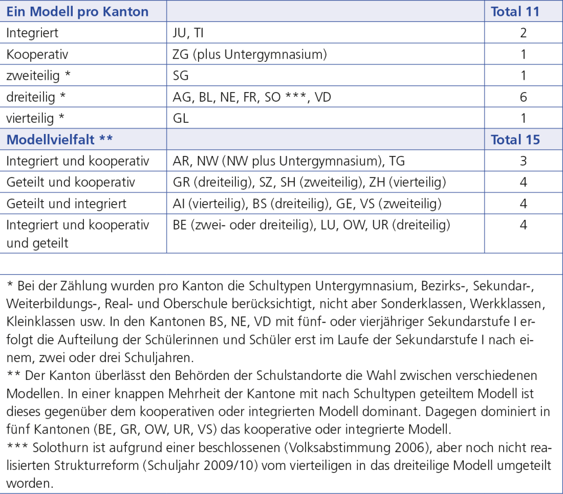 Wie die Ausführungen zu den drei Modellen zeigen, ist das schweizerische Schulsystem (mit Ausnahme der Kantone Jura und Tessin) durch frühe Selektionsmechanismen geprägt, die dazu führen, dass Schülerinnen und Schüler bereits auf der Sekundarstufe I unterschiedlichen Schultypen und Anforderungsniveaus zugewiesen werden.