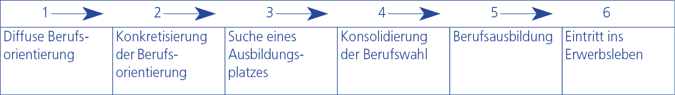 Nach einer ersten Phase der diffusen Berufsorientierung, bei der Jugendliche noch keine konkreten Berufswünsche haben, folgt eine Phase der Konkretisierung der Berufsorientierung. Hier werden konkrete Vorstellungen entwickelt und Entscheidungen zur nachobligatorischen Ausbildung getroffen. In einer dritten Phase geht es darum, die Suche nach einem Ausbildungsplatz aufzunehmen. Wenn ein solcher Platz gefunden und, im Falle einer beruflichen Grundbildung, ein Lehrvertrag abgeschlossen ist, folgt in einer vierten Phase die Konsolidierung der Berufswahl. In dieser Phase wird die Entscheidung für einen Beruf entweder verfestigt oder aufgrund von Erfahrungen verändert. Auf diese Phase, in der sich die Lernenden zu Beginn der Berufsausbildung befinden, werden wir in → Kapitel 2.1 noch etwas näher eingehen. Die fünfte Phase, die eigentliche Berufsausbildung, umfasst den Verlauf einer schulischen oder beruflichen Ausbildung. Phase 6, Eintritt ins Erwerbsleben, beschreibt die Integration in den Arbeitsmarkt.