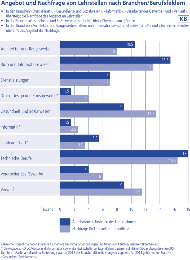 Die demografische Entwicklung der letzten Jahre hat dazu geführt, dass sich die Situation auf dem Lehrstellenmarkt geändert hat: So wurde 2013 ein Überhang an Lehrstellen ausgewiesen (SBFI, 2013b), nachdem seit Ende des letzten Jahrhunderts die jährlich wiederkehrende Lehrstellenknappheit dazu geführt hatte, dass nicht genügend Lehrstellen für die an einer beruflichen Ausbildung interessierten Jugendlichen verfügbar waren. Diese aus Sicht der Jugendlichen günstige Entwicklung wird sich in den nächsten Jahren fortsetzen (BfS, 2012). Trotzdem ist nicht garantiert, dass Jugendliche problemlos ihren Wunschberuf erlernen können.