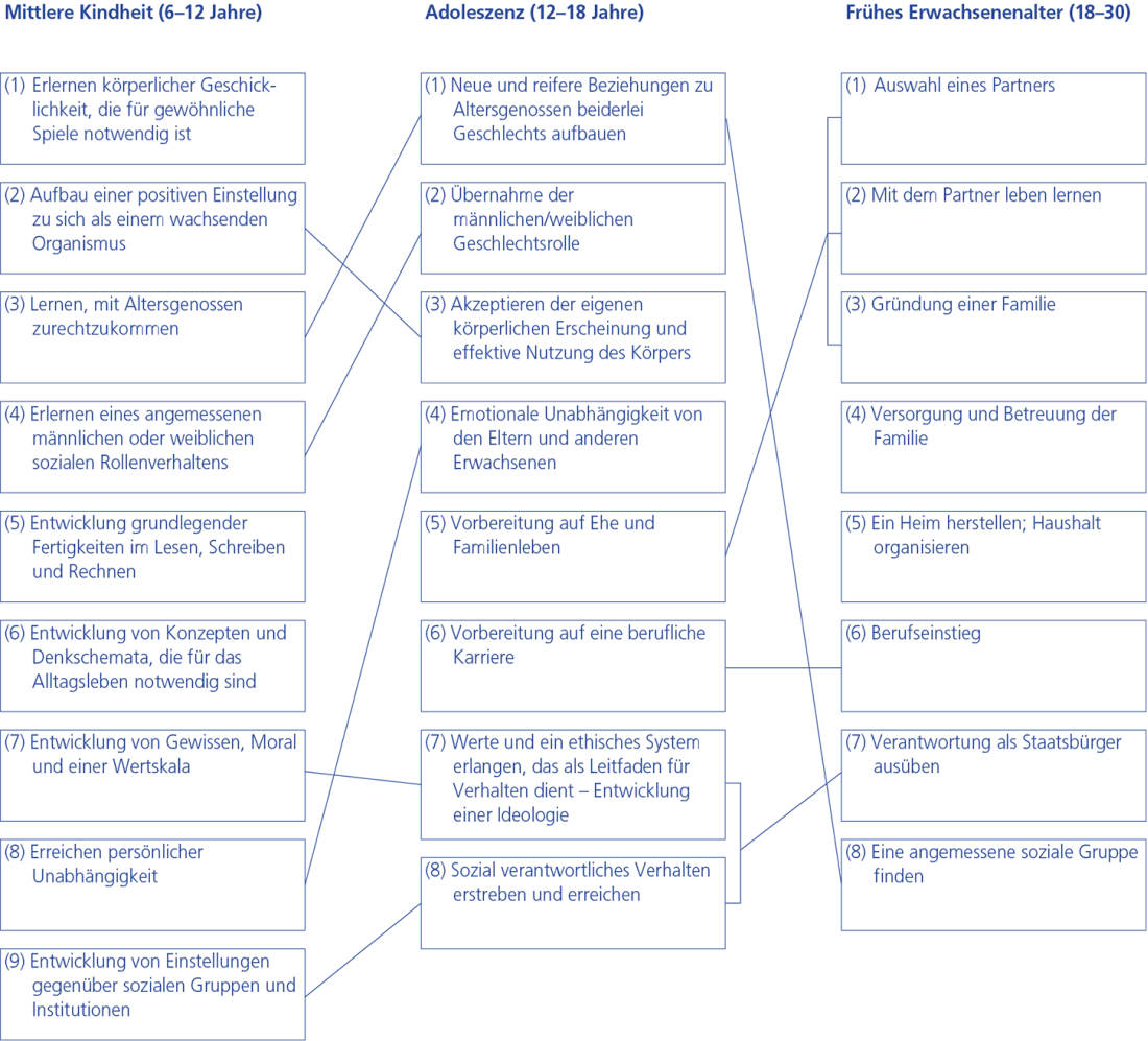 Das psychologische Konzept der Entwicklungsaufgaben nach Havighurst (1948) schreibt jeder Lebensphase bestimmte Aufgaben zu, die ein Individuum erfolgreich meistern muss, damit Glück und Erfolg gewährleistet und gesellschaftliche Ablehnung und persönliches Versagen verhindert werden. Die Aufgaben können als kulturell und gesellschaftlich definierte Anforderungen und Erwartungen verstanden werden, denen man sich in bestimmten Lebensphasen stellen muss. Damit ist sowohl eine individuelle, persönliche als auch eine normative, von der Gesellschaft vorgegebene Dimension angesprochen.