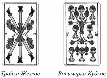 Вплоть до начала XX века Младшие Арканы иллюстрировались не более выразительно, чем современные игральные карты. Сегодня подобные изображения можно найти, например, в колоде Марсельского Таро. Если не считать обычных в таком случае узоров, рисунки на них показывают просто достоинство карты соответствующей масти и числа. На карте Тройки Жезлов можно увидеть только три Жезла, а на Восьмерке Кубков – восемь Кубков, и ничего более. Эти карты играют вспомогательную роль в системе старшинства при толковании, показывая разве что комбинацию числа с элементом, который соответствует Жезлам, Мечам, Пентаклям или Кубкам. Подробное традиционное толкование карт вы сможете найти в этой книге обо всех 56 Младших Арканах.
