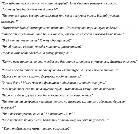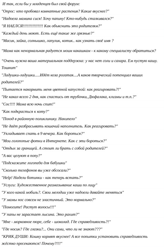 Пока я наслаждалась водными процедурами, муж, нашёл в недрах сети форум младенцев, и угорая от смеха, зачитывал его в слух нашей дочери.