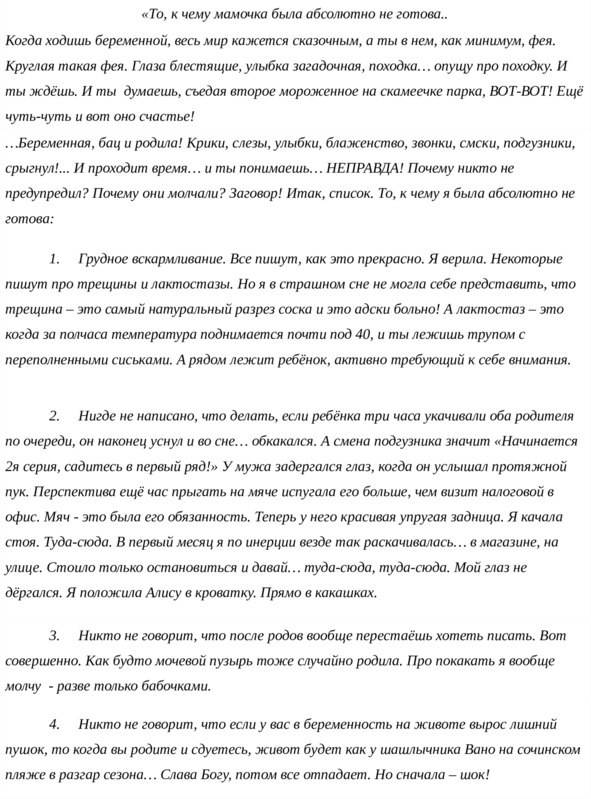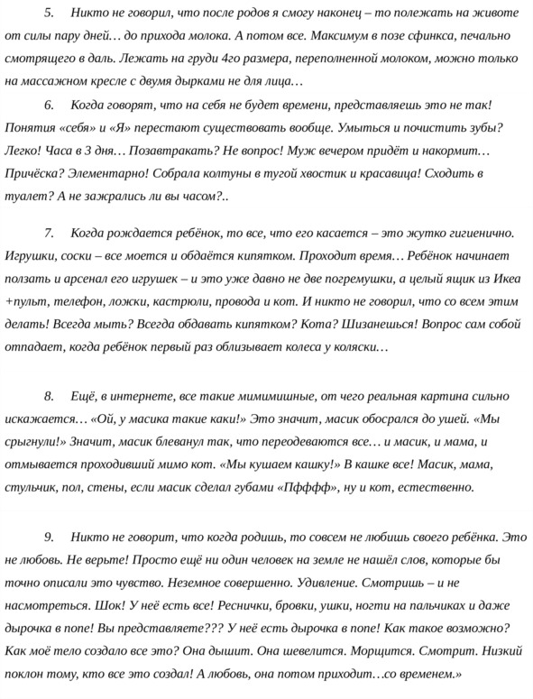 Улыбка, появившаяся на «Ой, у масика такие каки!» Это значит, масик обосрался до ушей.» сменилась грустью. Да, многое из того, что написала девушка действительно правда. Но правда мимолетная, правда, на которую не обращаешь внимание, потому что слишком не важно и молниеносно заканчивается. А ребёночек, этот дар Божий, этот цветочек сладостный, с маленькими ножками и ручками, с беззубой улыбкой и огромной любовью, который лишь одним своим посапыванием стирает все временные неудобства и недомогания. Мне кажется, что не стоит делать из себя жертву и терпеть что либо, чтобы в дальнейшем попрекать того самого сладкого, ради и из-за которого все мучения.