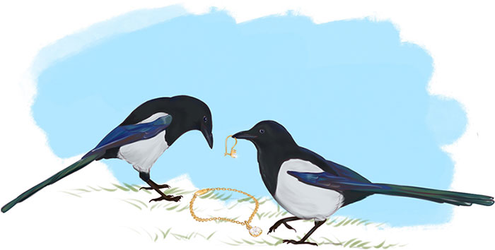 Сороки живут по берегам рек. У них короткие крылья и длинный хвост, им так удобно. Им настолько удобно, что они могут и не по берегам рек, а даже в городе жить, вот как удобно! Везде, где они живут, сороки собирают блестящие штуки и тащат к себе в гнездо. Всякие блесны собирают, мормышки, монетки, серебряные ложечки, часы с репетиром, конфетные обертки, стеклышки и прочее. Собирают и тащат, и складывают. Потом, когда сложили, они начинают гордиться своими коллекциями – нельзя же не ценить того, чем и так все время занимаешься! Они даже зовут других сорок, и сами ходят в гости – любоваться, ну и там своровать, что плохо лежит. Это глупые сороки. А умные толстые сороки живут себе по берегам рек, растят детей и не занимаются всякой фигней. Потому что по берегам рек блестит рыба!