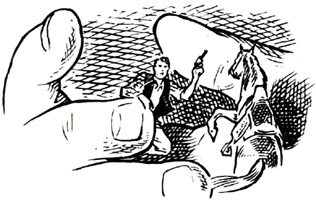 The cowboy had now recovered a little. He scrambled back through the finger-gap and said something to the horse which sounded like “Whoaback, steady, fella.” Then he slid down and grabbed the reins, holding them just below the horse’s nose. He patted its face. That seemed to calm it. Then, looking round swiftly but not apparently noticing the enormous faces hanging over him, he reached cautiously down and picked the pistol up from between the horse’s hooves.