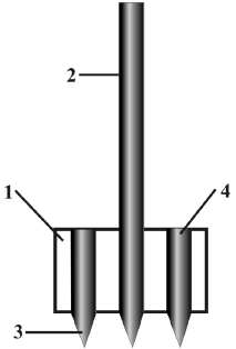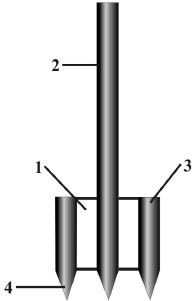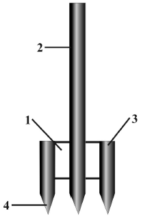 • 3, 4 – штырьки 13—14x3x3 см. Расстояние меду вершинами штырей и черенка – 8—10 см; между рядами – 25–30 см.
