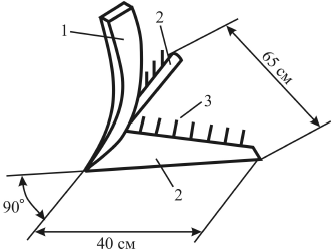 Рыхлитель состоит из: несущего кронштейна (1), двух симметричных лап (2) и бороны (3). Кронштейн можно сделать из старого зуба рыхлителя почвы или подходящего куска лома. Симметричные лапы рыхлителя должны быть сделаны из листовой стали толщиной около 5 мм. Их рабочие кромки нужно заточить на наждаке по верхней плоскости.
