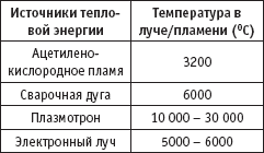 Вся история человечества связана с освоением энергии, в частности тепловой энергии. От древнего пламени костра до управления потоками света в лазерном луче – вот история технологии. В таблице 1 приведены данные о плотности потоков тепловой энергии и минимально достижимых площадях нагрева материалов, т. е. фокусировке потоков энергии в пятно нагрева.